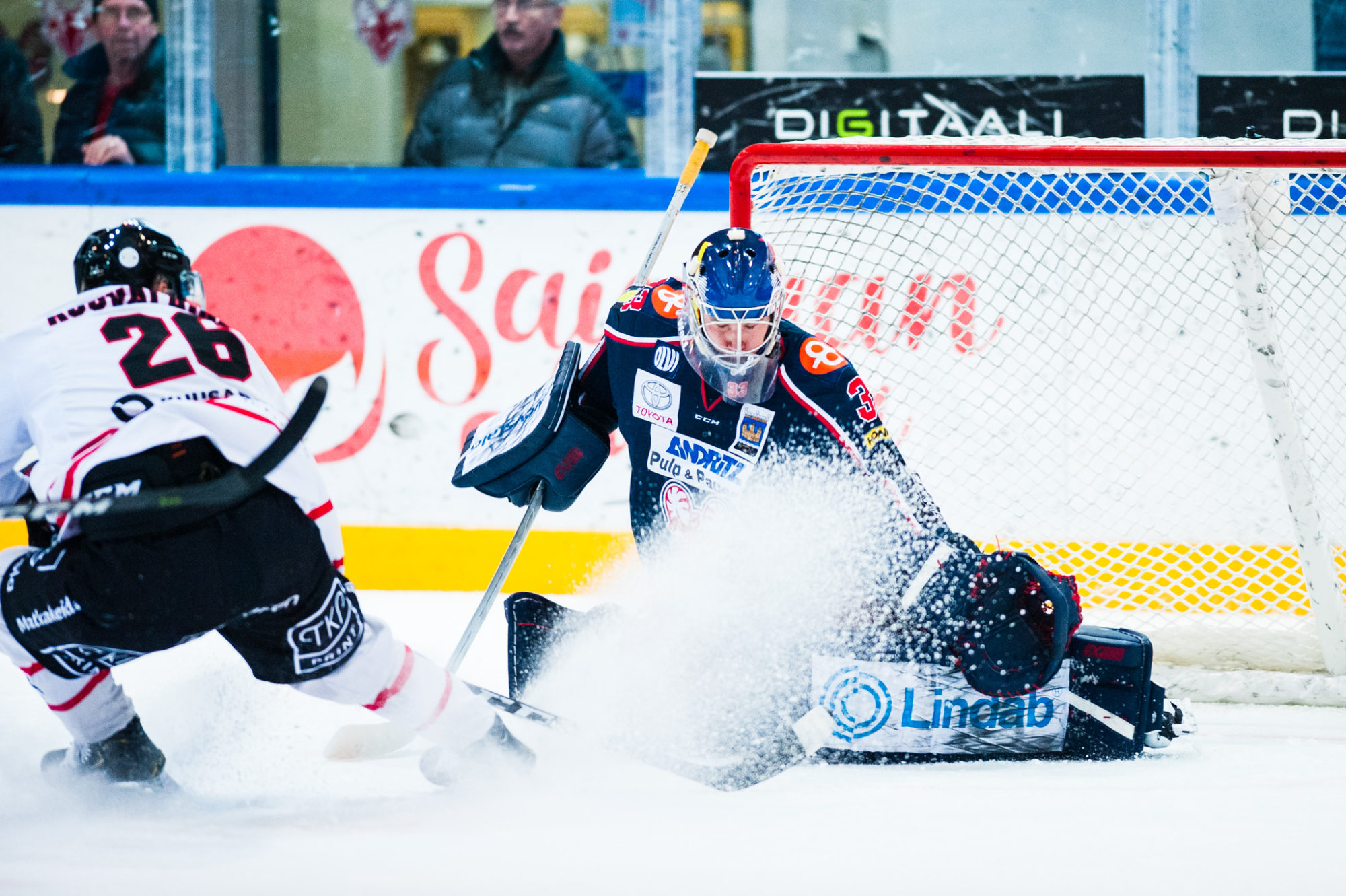 Roope Urpolahti sai olla tarkkana entisen joukkuekaverinsa kanssa. Hetken päästä Niklas Salo laukoikin kiekon maaliin.